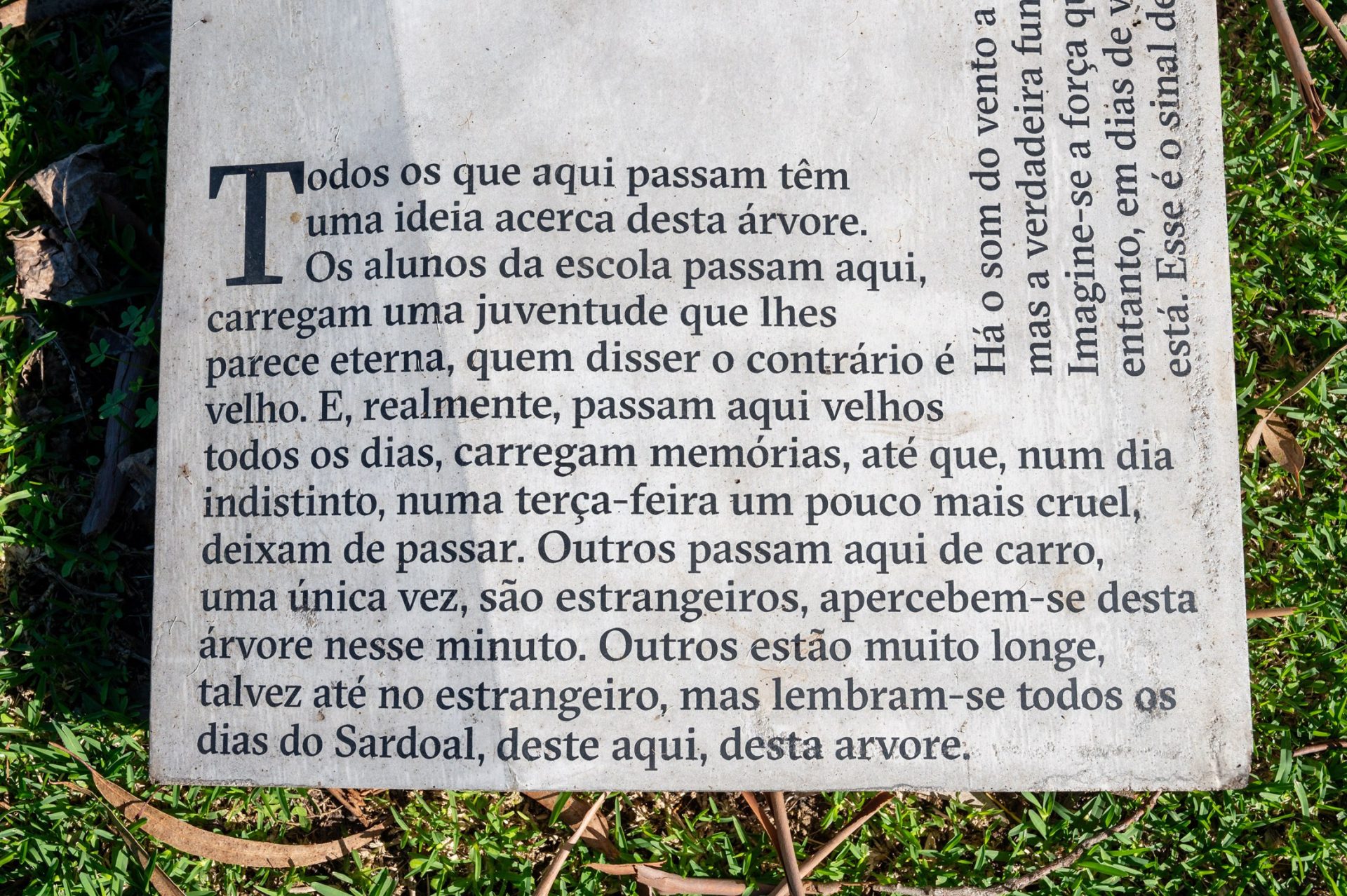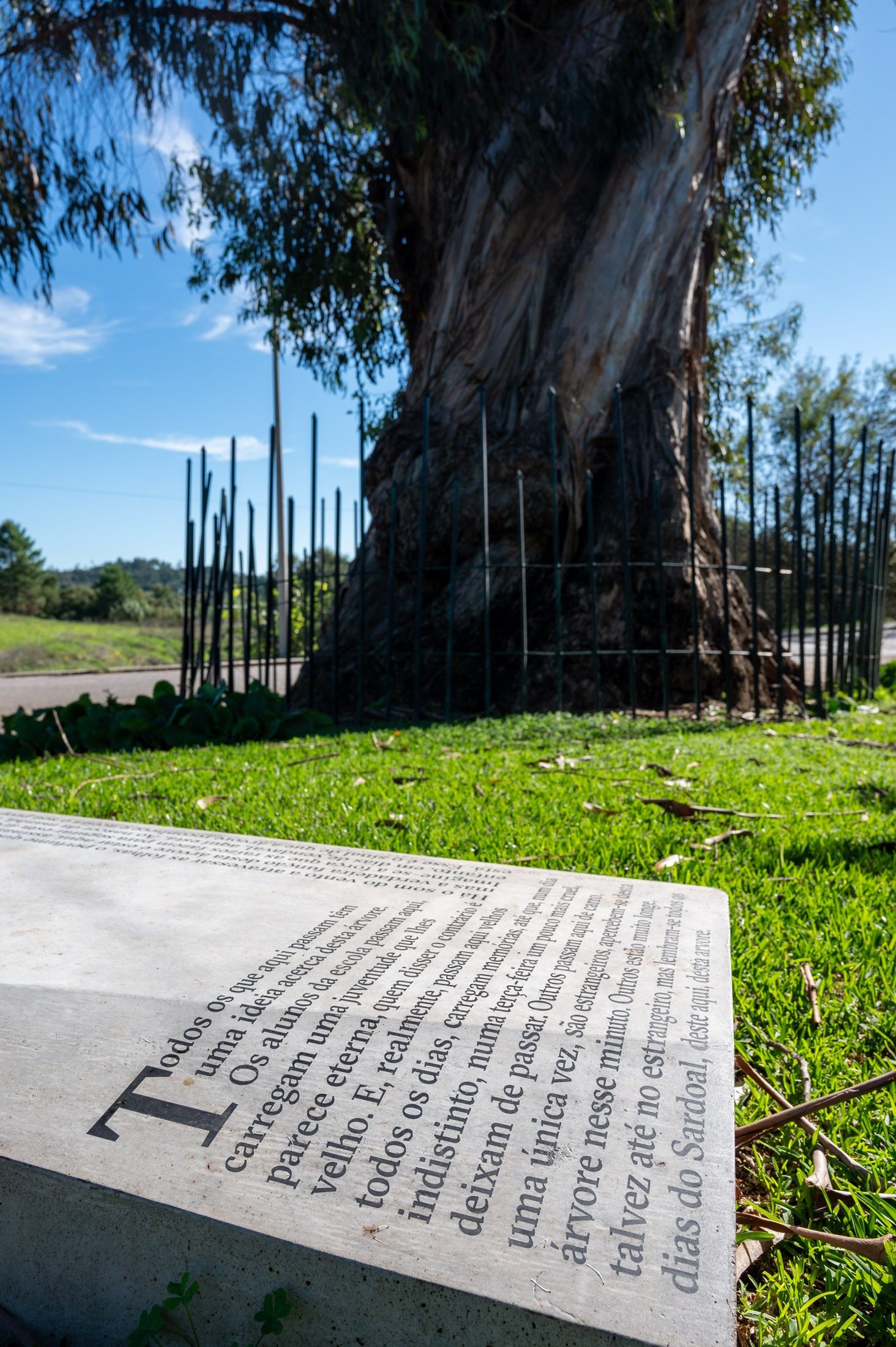 Todos os que aqui passam têm uma ideia acerca desta árvore. Os alunos da escola passam aqui, carregam uma juventude que lhes parece eterna, quem disser o contrário é velho. E, realmente, passam aqui velhos todos os dias, carregam memórias, até que, num dia indistinto, numa terça-feira um pouco mais cruel, deixam de passar. Outros passam aqui de carro, uma única vez, são estrangeiros, apercebem-se desta árvore nesse minuto. Outros estão muito longe, tal- vez até no estrangeiro, mas lembram-se todos os dias do Sardoal, deste aqui, desta árvore.