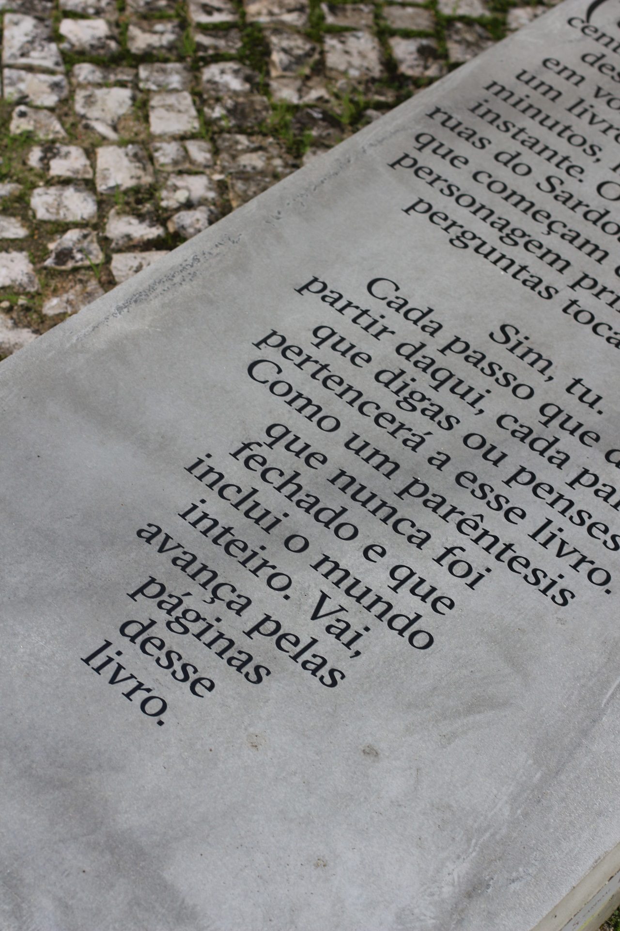 (Perante uma geometria de tempo e espaço, o centro do Sardoal é o centro do mundo. Essa é a grandeza desta Praça da República, olha em volta. A partir daqui, começa um livro. O tempo da ação são os minutos, horas e dias depois deste instante. O espaço da ação são as ruas do Sardoal, todos os caminhos que começam exatamente aqui. A personagem principal és tu. Eu?, perguntas tocando o peito. Sim, tu. Cada passo que dês a partir daqui, cada palavra que digas ou penses pertencerá a esse livro. Como um parêntesis que nunca foi fechado e que inclui o mundo inteiro. Vai, avança pelas páginas desse livro.