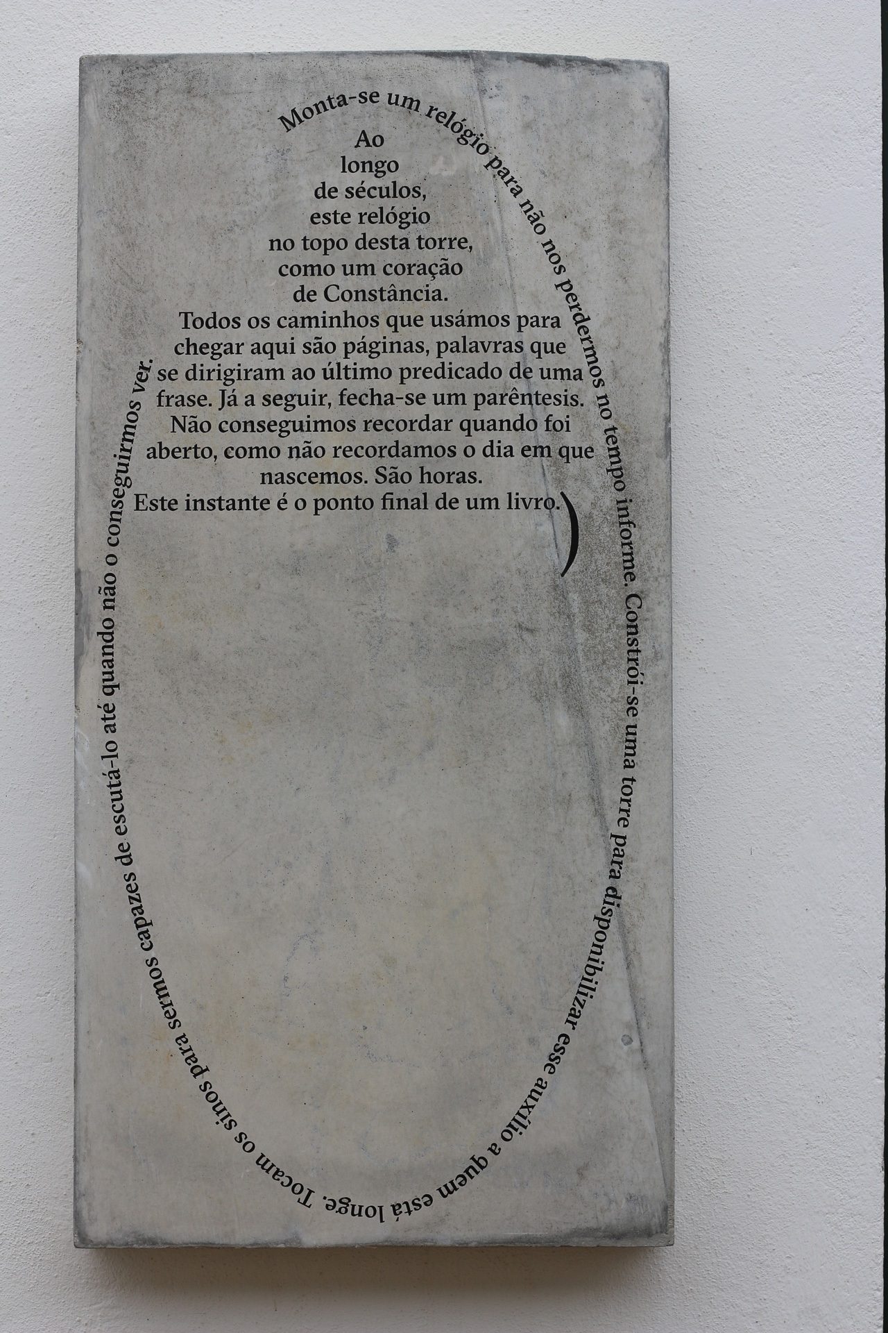 Monta-se um relógio para não nos perdermos no tempo informe. Constrói-se uma torre para disponibilizar esse auxílio a quem está longe. Tocam os sinos para sermos capazes de escutá-lo até quando não o conseguirmos ver. Ao longo de séculos, este relógio no topo desta torre, como um coração de Constância. Todos os caminhos que usámos para chegar aqui são páginas, palavras que se dirigiram ao último predicado de uma frase. Já a seguir, fecha-se um parêntesis. Não conseguimos recordar quando foi aberto, como não recordamos o dia em que nascemos. São horas. Este instante é o ponto final de um livro.